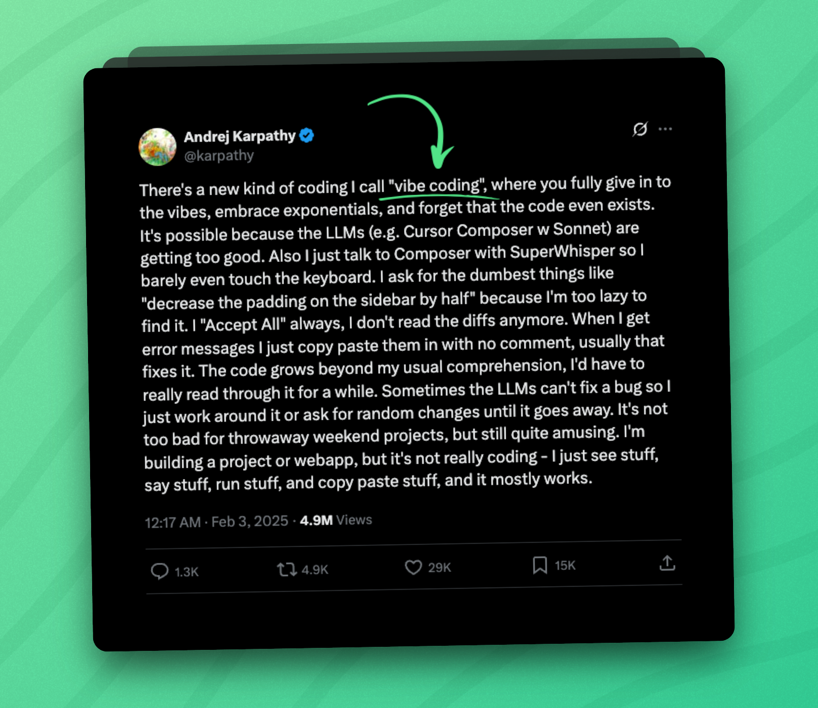 If you're not living under a rock, you've probably heard of it. You trade clean code and full understanding of the codebase for extreme shipping velocity. The term comes from the extremely cracked engineer Andrej Karpathy: